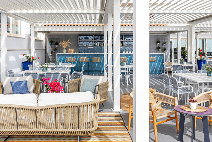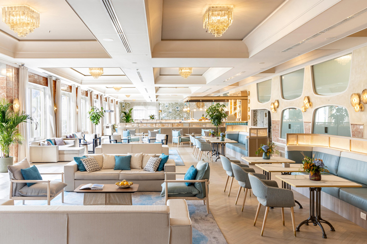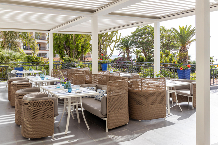 From the outset, the Zen Group envisaged adding a new bar in the centre of the space, which would serve as a visual anchor but also divide the space and make it more intimate. With the new layout, smart workers and leisure guests can meet using a multi-purpose area that can accommodate everyone thanks to the different seating typology. The style is elegant, Mediterranean, with the colours of the sea and the Taormina stone blending the indoor and outdoor colour palette.