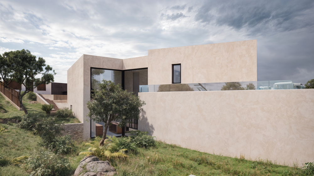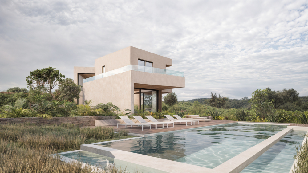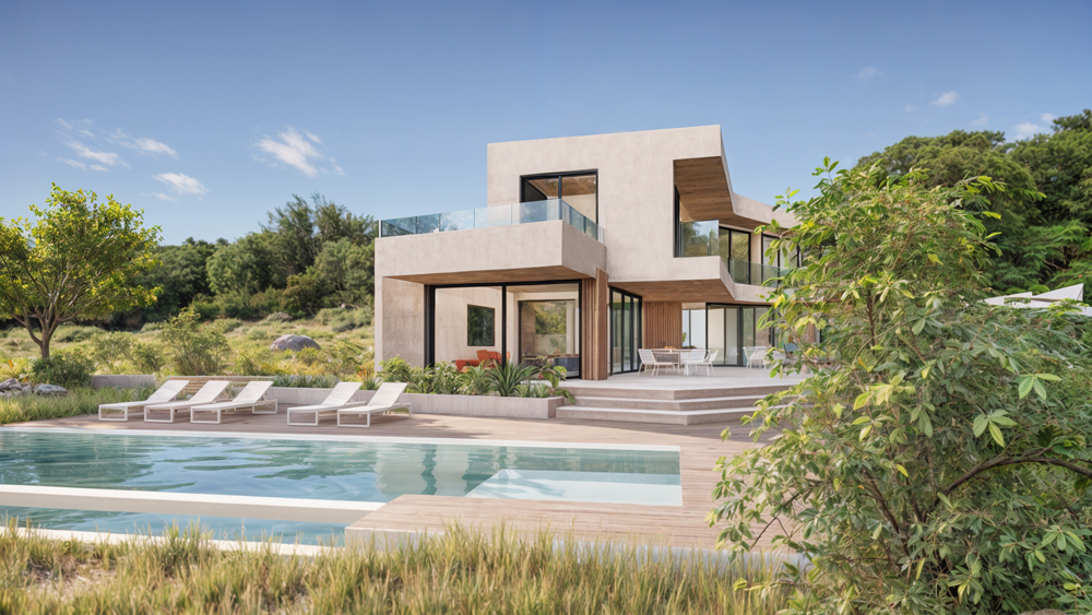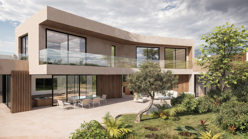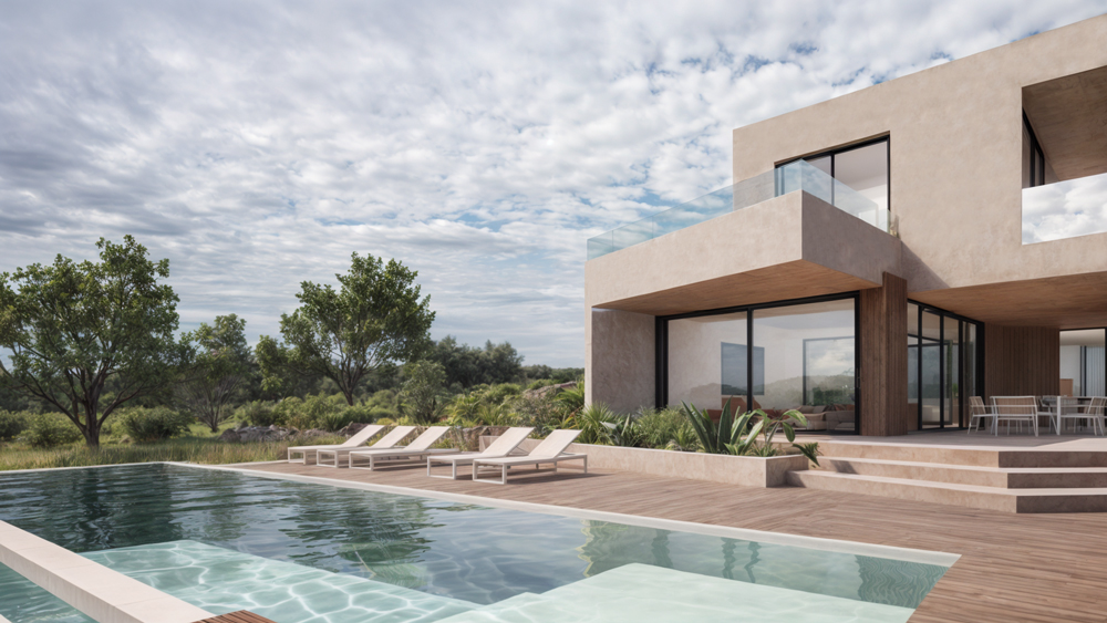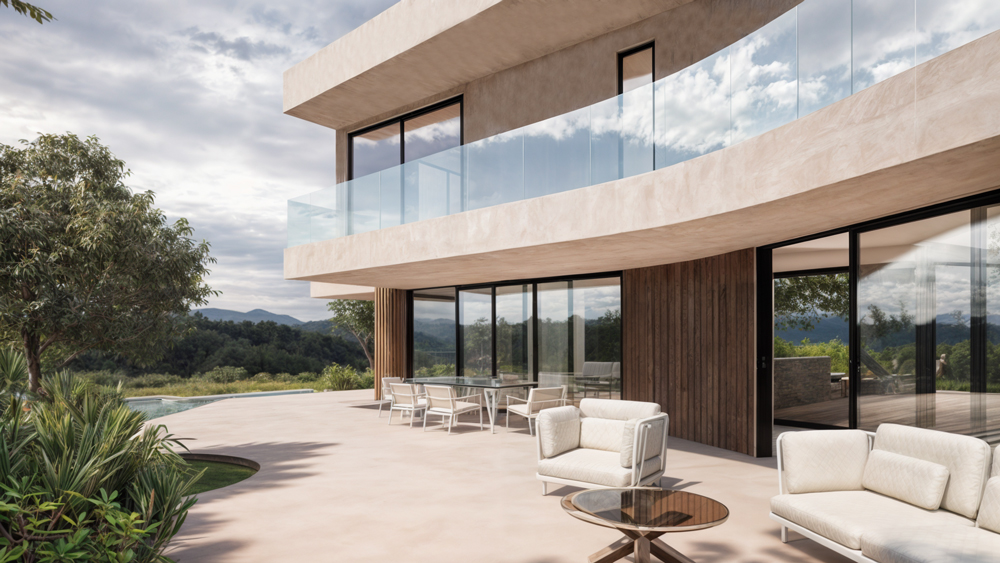 Our Valle Romano project features a striking contemporary design that seamlessly integrates with the natural landscape. The clean lines, expansive windows, and tasteful use of materials create an inviting and sophisticated atmosphere. The façade is a harmonious blend of sleek glass panels and warm wooden accents, perfectly balancing modernity with nature.